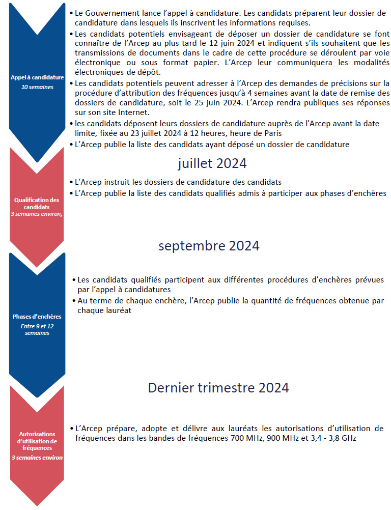 L'Arcep prévoit, comme le précise le calendrier indicatif ci-dessous, que les procédures aboutissent d'ici la fin du dernier trimestre 2024 ; elle pourra alors délivrer les autorisations d'utilisation de fréquences aux lauréats.