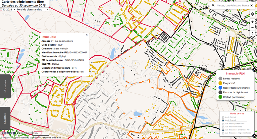 cartefibre.arcep.fr permet de visualiser les immeubles et de suivre de façon précise l'avancée des déploiements FttH. La vue prévisionnelle donne aussi la possibilité de s’informer sur le délai de raccordement à la fibre optique à l’échelle de la commune.