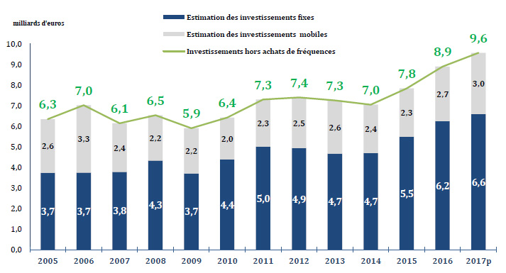 En 2017, les opérateurs ont investi 660 millions d'euros de plus que l'année précédente pour un montant global (hors fréquences) de 9,6 milliards d'euros.