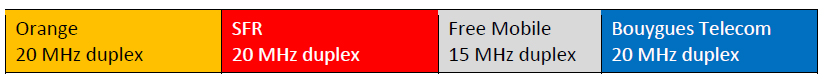 - Bande 1800 MHz : Bouygues Telecom, Orange et SFR se voient attribuer 20 MHz duplex. La société Free Mobile n’était pas candidate à l’attribution de fréquences dans cette bande de fréquences. Elle dispose d’une autorisation d’utilisation de fréquences dans cette bande de 15 MHz duplex jusqu’en 2031.