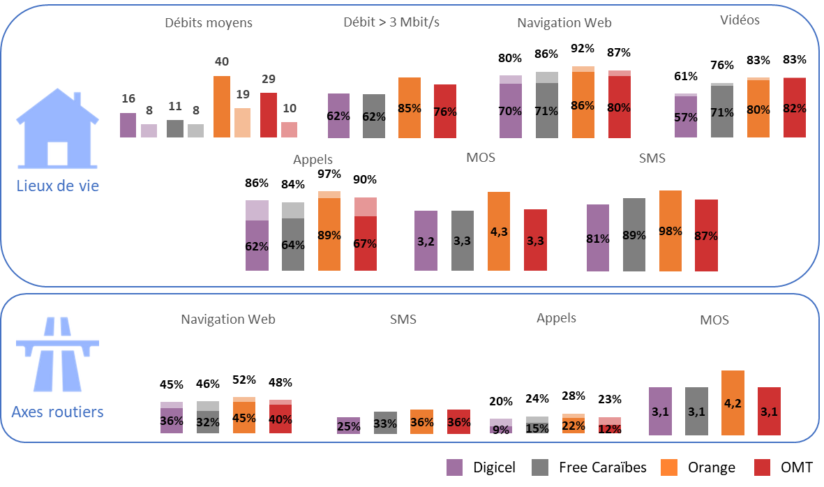 - À Saint-Martin, Free Caraïbe présente de bonnes performances sur les usages d’internet et se classe deuxième. Dauphin Telecom se place troisième derrière Free Caraïbe pour les vidéos visionnées en qualité parfaite. UTS se classe deuxième pour les indicateurs de communications réussies dans les lieux de vie et la navigation web sur les axes routiers..