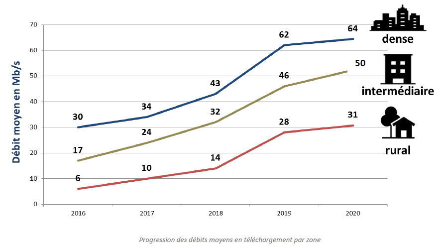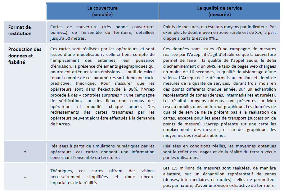L’indicateur présentant le débit moyen est une information intéressante mais qui n’illustre qu’un volet de la qualité de service. Par exemple, un opérateur qui couvre peu mais offre des débits très élevés dès lors que l’utilisateur est couvert, peut présenter un débit moyen similaire à un opérateur avec une couverture large mais avec des débits plus faibles. L’expérience utilisateur sera cependant différente entre ces deux opérateurs.