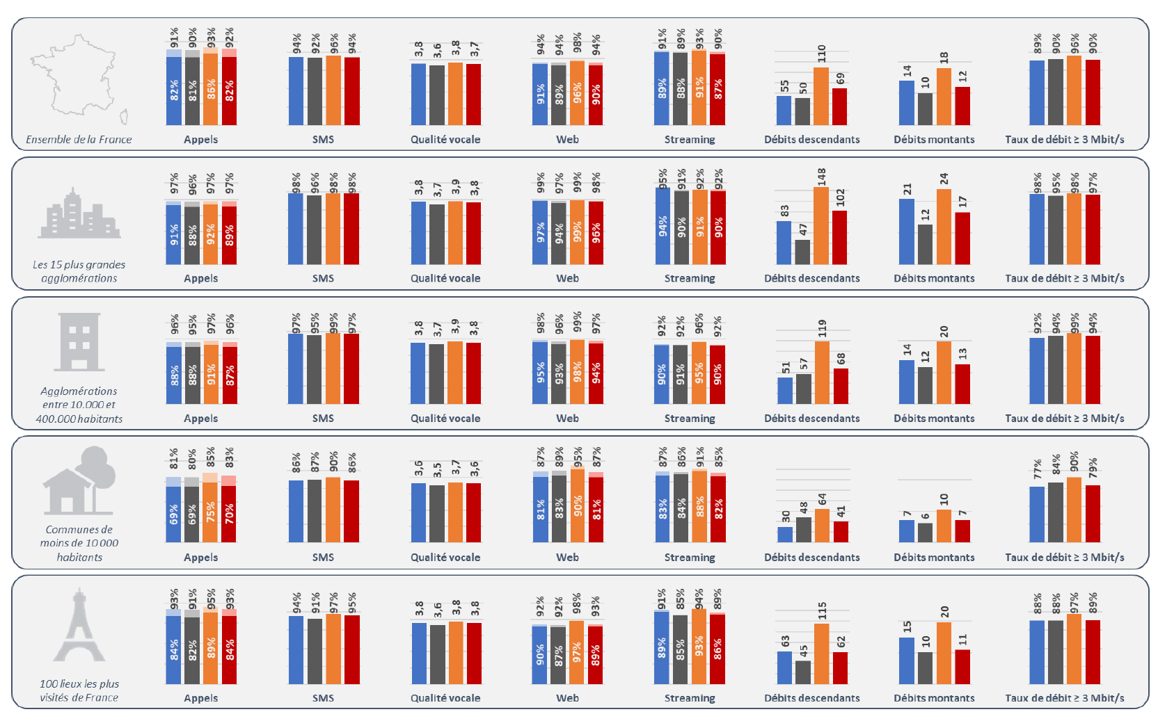 Cet indicateur, tous opérateurs confondus, progresse de 8 points en zones rurales, passant de 73,9% à 82,3%, traduisant les efforts de déploiement des opérateurs en zones peu denses : ainsi, sur les usages courants, l’écart de qualité de service entre les zones rurales et urbaines continue ainsi à se réduire.