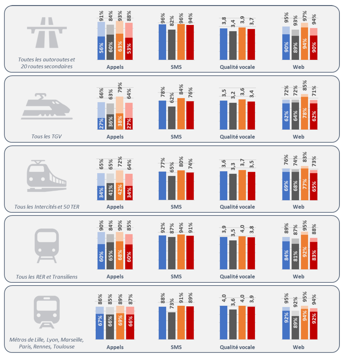 Appels : taux d’appels maintenus 2 minutes et taux d’appels maintenus 2 minutes sans perturbations audibles. En transports, les appels sont réalisés entre deux SIM d’un même opérateur (appels « intra-opérateurs ») ; n lieux de vie, les appels sont réalisés avec toutes les combinaisons de SIM (appels « intra-opérateurs » et « inter-opérateurs »)