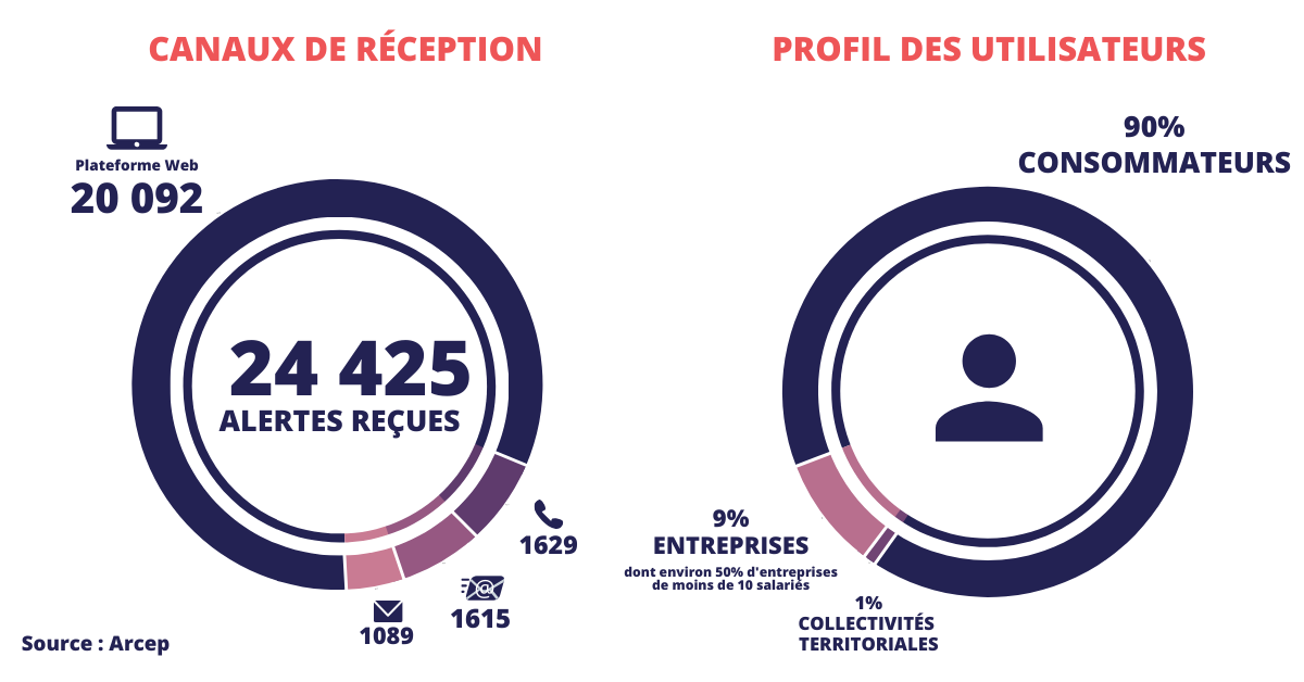 L'Arcep a reçu en 2019 [1] près de 24 000 alertes dont 20 000 directement sur la plateforme, les autres signalements provenant d'autres canaux (mails, courriers, appels téléphoniques).