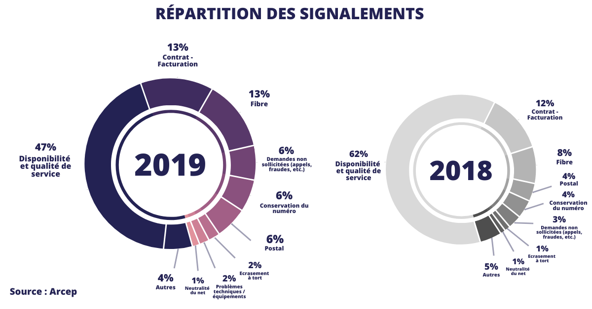 - et 20 000 alertes ont été signalées directement sur la plateforme « J'alerte l'Arcep » en 2019 contre 28 000 en 2018.