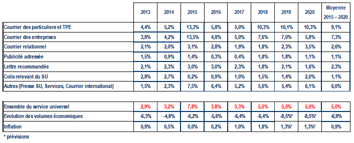 Cette décision a plafonné la hausse annuelle moyenne des tarifs sur le périmètre du service universel postal (2) à 5 % en termes nominaux, contrairement aux dispositifs précédents qui permettaient une modulation des hausses sur la période. Dans le cadre de ce plafond, il appartient à La Poste d'organiser l'évolution de ses prix.