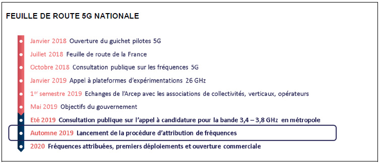 Le 21 novembre 2019, l’Arcep a proposé au Gouvernement un cahier des charges pour l’attribution de la bande 3,4 ‑ 3,8 GHz. Cette proposition, qui s’inscrit dans les objectifs de la France pour la 5G, fixe des obligations aux futurs lauréats et repose sur une procédure mixte d’attribution pour les 310 MHz de fréquences :