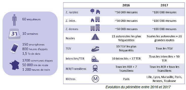 Le périmètre de l’enquête a considérablement été élargi cette année. Dans les zones d’habitation, le nombre de points de mesure a été doublé. S’agissant des axes de transport, la qualité a été mesurée sur l’ensemble des autoroutes et, pour la première fois, sur une vingtaine de grandes routes également. De même, ce sont tous les TGV et Intercités qui ont fait cette année l’objet de mesures, et plus de 60 TER. Enfin, l’Arcep a mesuré la qualité dans l’ensemble des métros en France, dont, pour la première fois, les métros de Lille, Lyon, Marseille, Rennes et Toulouse.