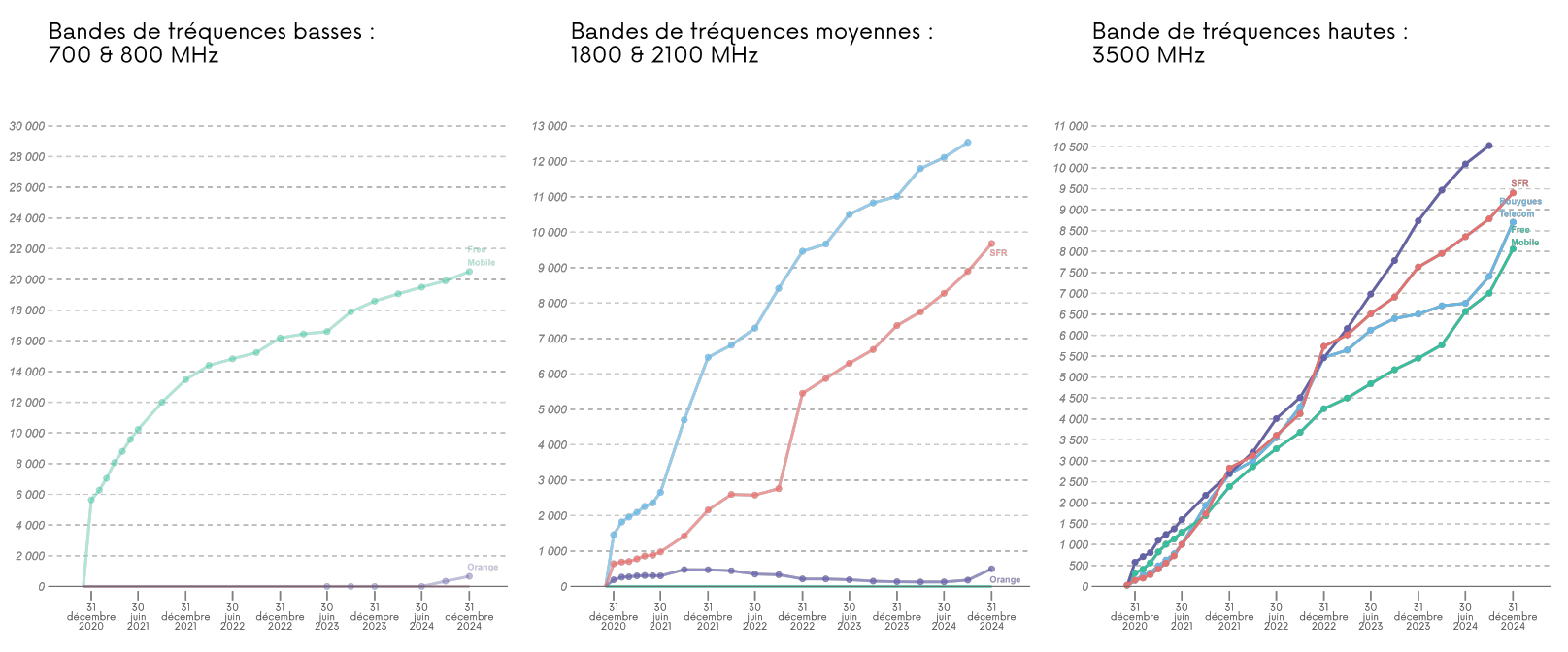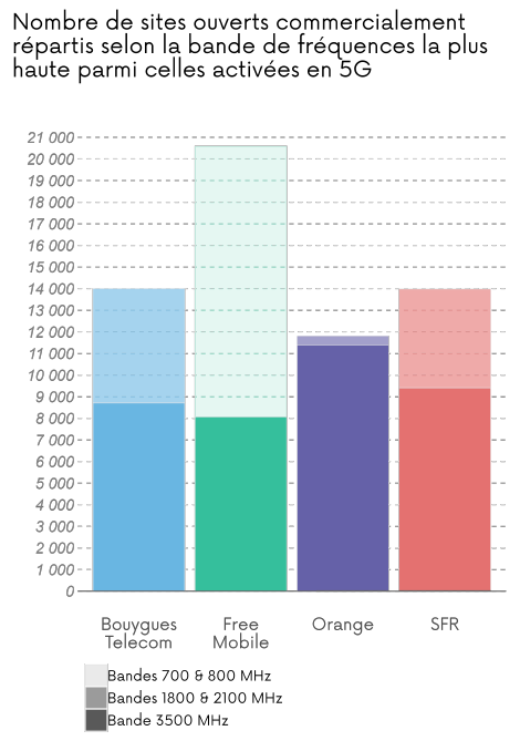 Dans le tableau ci-dessus et le graphique 2 ci-dessous, un même site peut être équipé de plusieurs bandes de fréquences pour fournir la technologie 5G. Ainsi, le nombre de sites total peut être inférieur à la somme des sites répartis selon les bandes de fréquences.