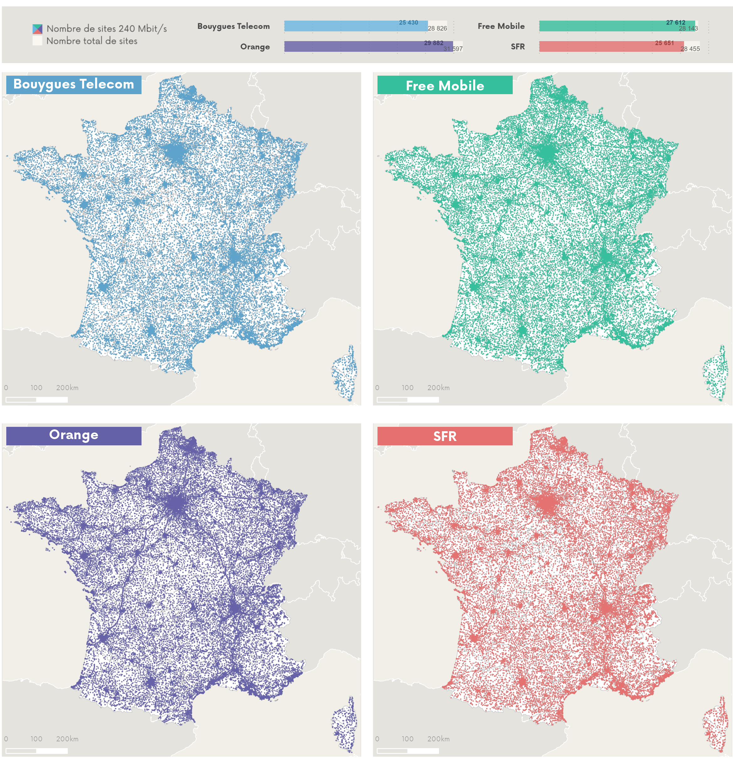 Il s’agit d’un débit maximum théorique, lié à la capacité installée sur chaque site. L'information est fournie par les opérateurs, ou réduite lorsqu'elle est manquante ou incomplète : un site est inclus dans la catégorie « 240 Mbit/s » dès lors que l'opérateur a activé au moins deux bandes de fréquences en 4G sur un site donné (« 4G+ »). Le débit réel peut dépendre de nombreux paramètres, comme la distance à l’antenne ou le nombre simultané d’utilisateurs.