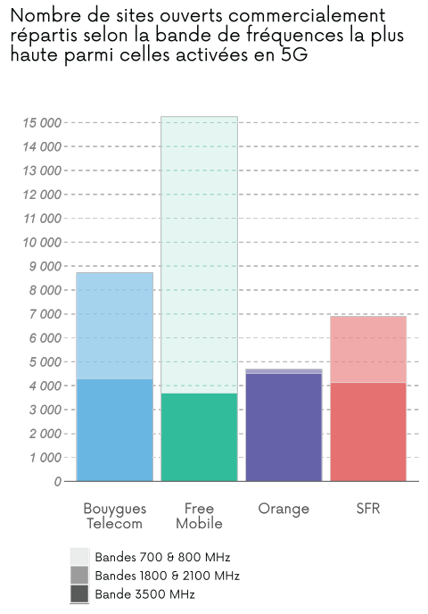 Dans le tableau ci-dessus et le graphique 2 ci-dessous, un même site peut être équipé de plusieurs bandes de fréquences pour fournir la technologie 5G. Ainsi, le nombre de sites total peut être inférieur à la somme des sites répartis selon les bandes de fréquences.