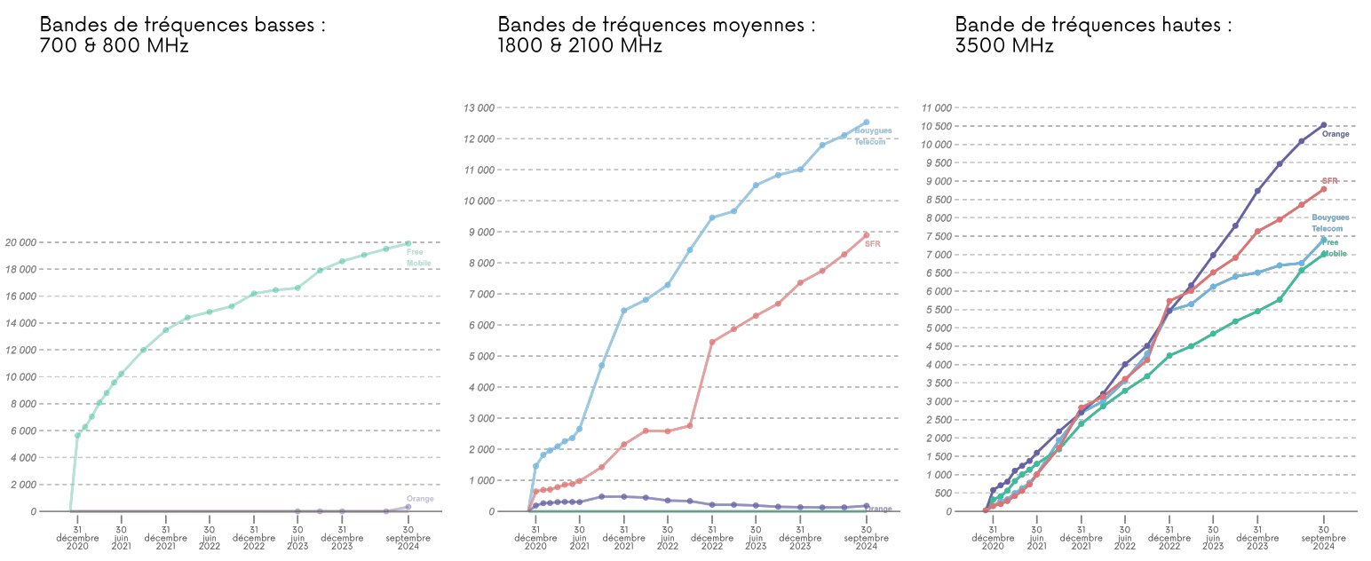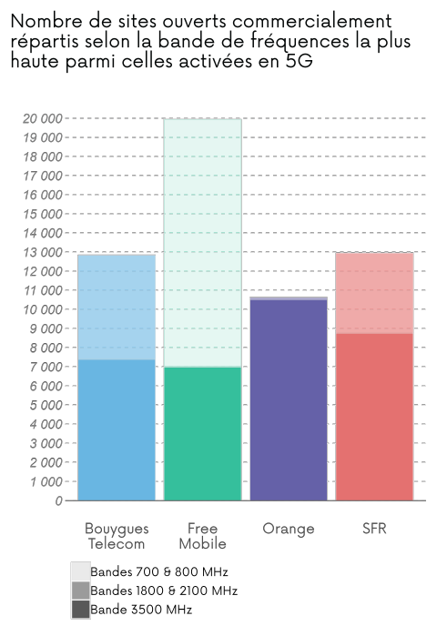 Dans le tableau ci-dessus et le graphique 2 ci-dessous, un même site peut être équipé de plusieurs bandes de fréquences pour fournir la technologie 5G. Ainsi, le nombre de sites total peut être inférieur à la somme des sites répartis selon les bandes de fréquences.