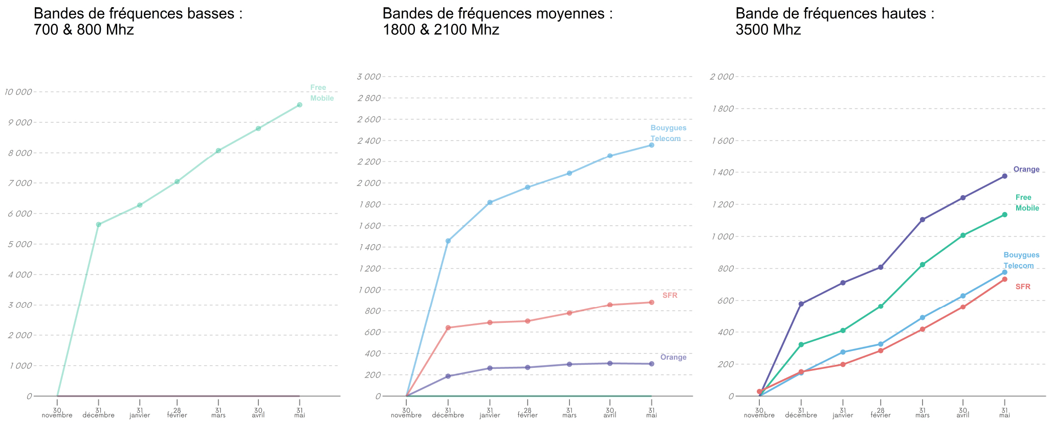 Dans le tableau ci-dessus et le graphique 2 ci-dessous, un même site peut être équipé de plusieurs bandes de fréquences pour fournir la technologie 5G. Ainsi, le nombre de sites total peut être inférieur à la somme des sites répartis selon les bandes de fréquences.