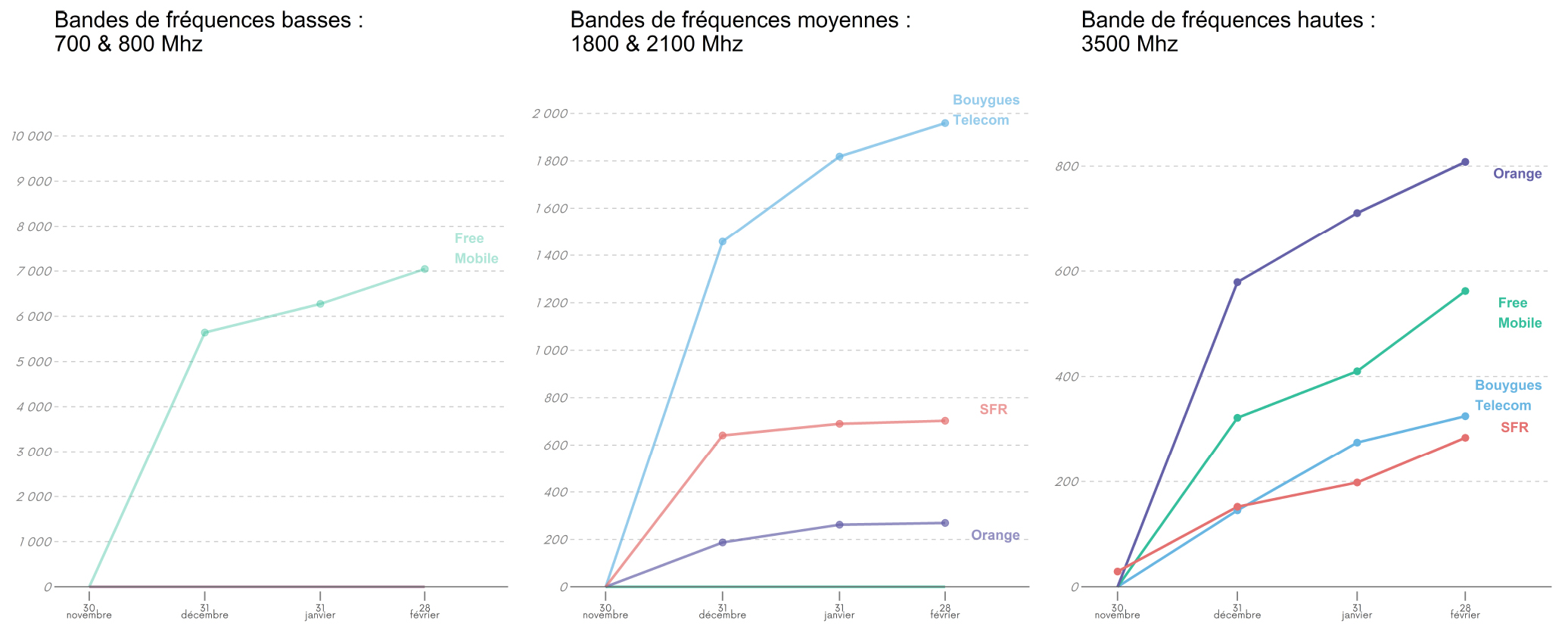 Dans le tableau ci-dessus et le graphique 2 ci-dessous, un même site peut être équipé de plusieurs bandes de fréquences pour fournir la technologie 5G. Ainsi, le nombre de sites total peut être inférieur à la somme des sites répartis selon les bandes de fréquences.