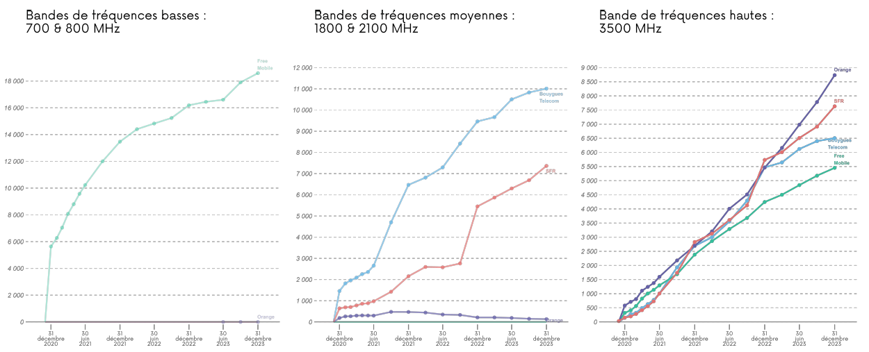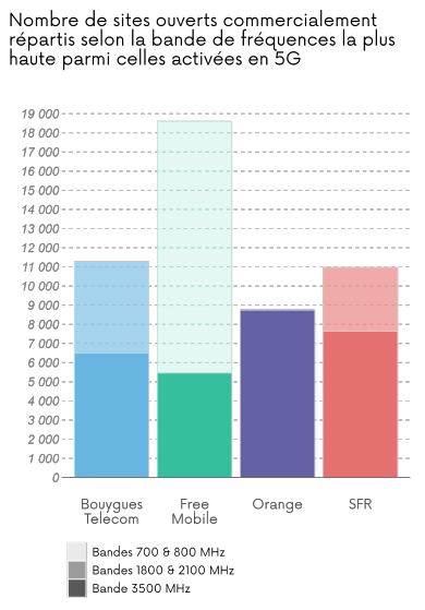 Dans le tableau ci-dessus et le graphique 2 ci-dessous, un même site peut être équipé de plusieurs bandes de fréquences pour fournir la technologie 5G. Ainsi, le nombre de sites total peut être inférieur à la somme des sites répartis selon les bandes de fréquences.