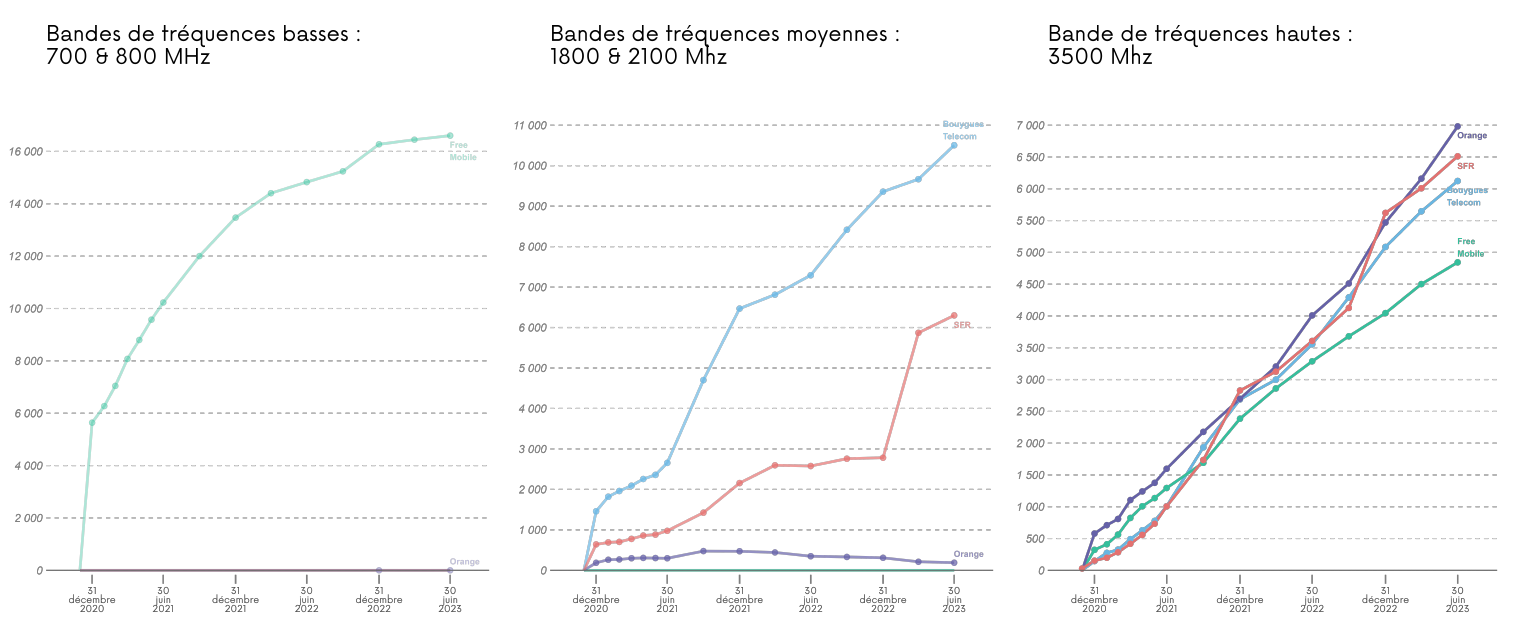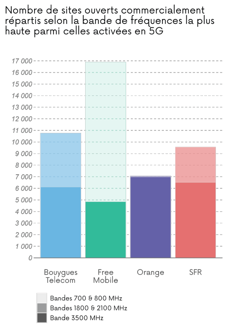 Dans le tableau ci-dessus et le graphique 2 ci-dessous, un même site peut être équipé de plusieurs bandes de fréquences pour fournir la technologie 5G. Ainsi, le nombre de sites total peut être inférieur à la somme des sites répartis selon les bandes de fréquences.