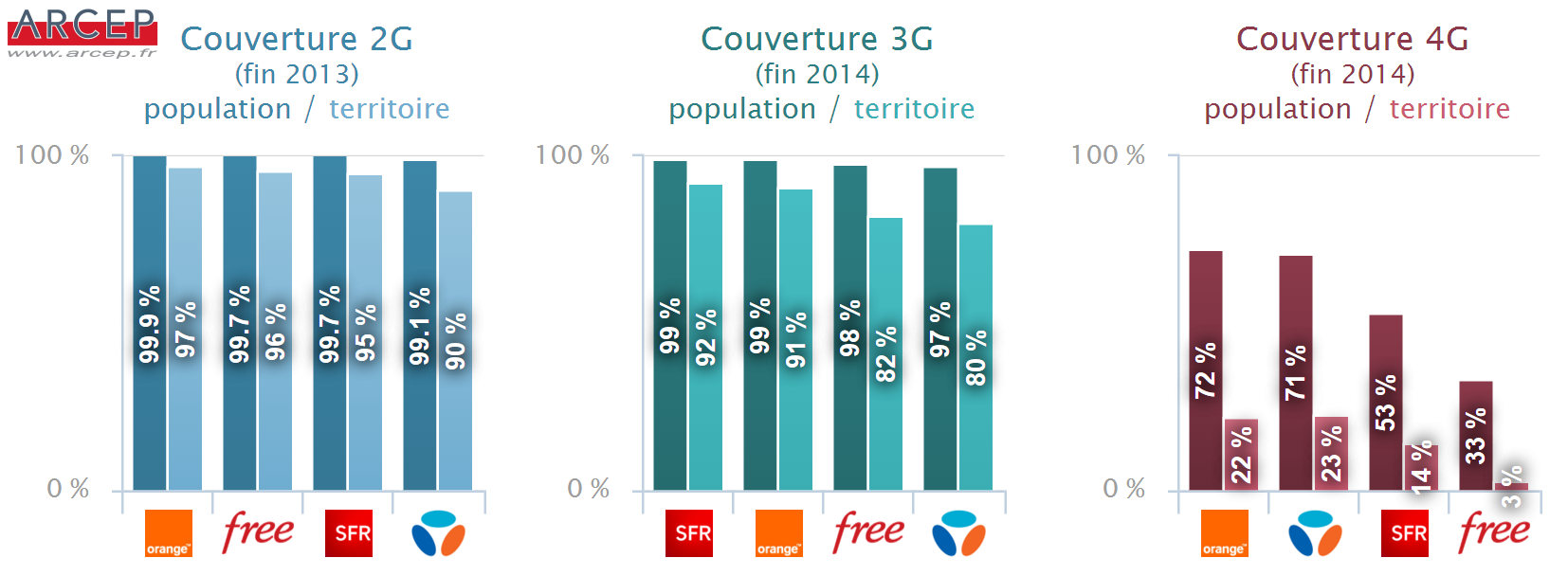 Les taux de couverture ci-dessous expriment une couverture à l'extérieur des bâtiments et ont été calculés à partir des dernières cartes de couverture vérifiées sur le terrain, sous le contrôle de l'ARCEP. Elles datent de fin 2013 s'agissant de la 2G, et fin 2014 s'agissant de la 3G et de la 4G. Il faut rappeler que ces informations sont représentatives du service délivré aux utilisateurs, et non du seul réseau appartenant à l'opérateur concerné : la couverture affichée tient compte des accords de mutualisation et d'itinérance passés avec d'autres opérateurs.