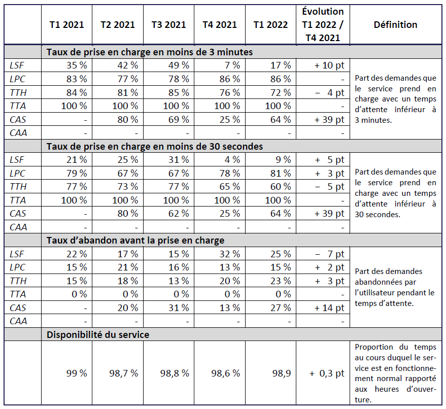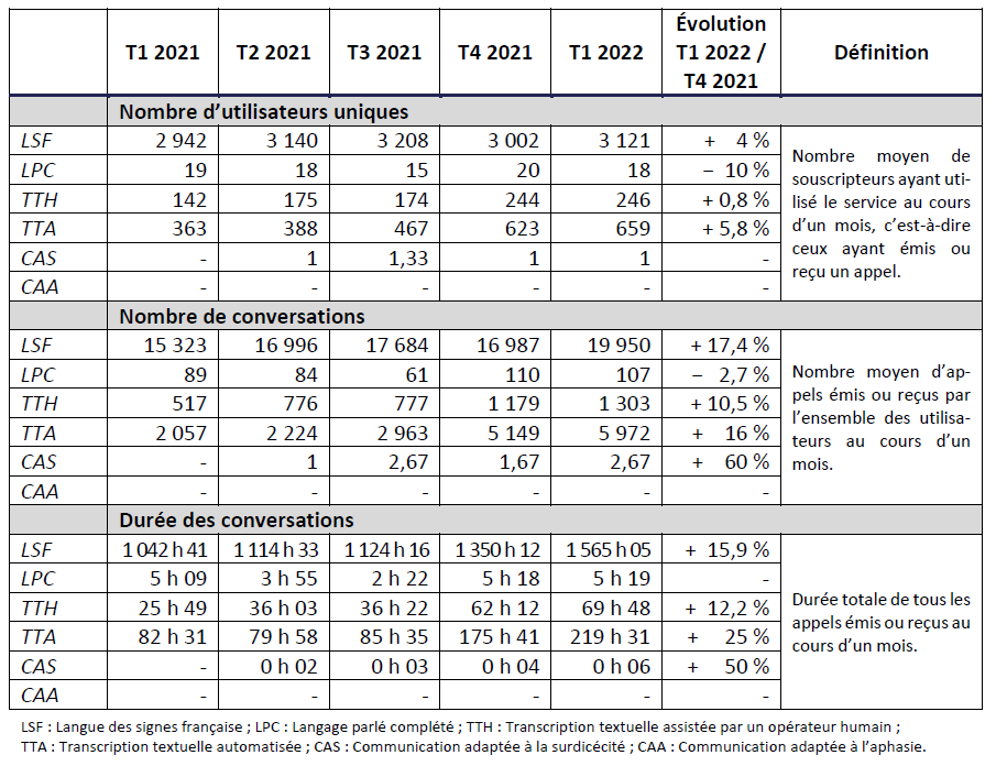 Enfin, l’offre destinée aux personnes sourdaveugles, mise en place depuis le 3e trimestre 2021 par certains opérateurs, continue de faire l’objet de tests qui donnent lieu à quelques rares connexions au centre relais téléphonique.