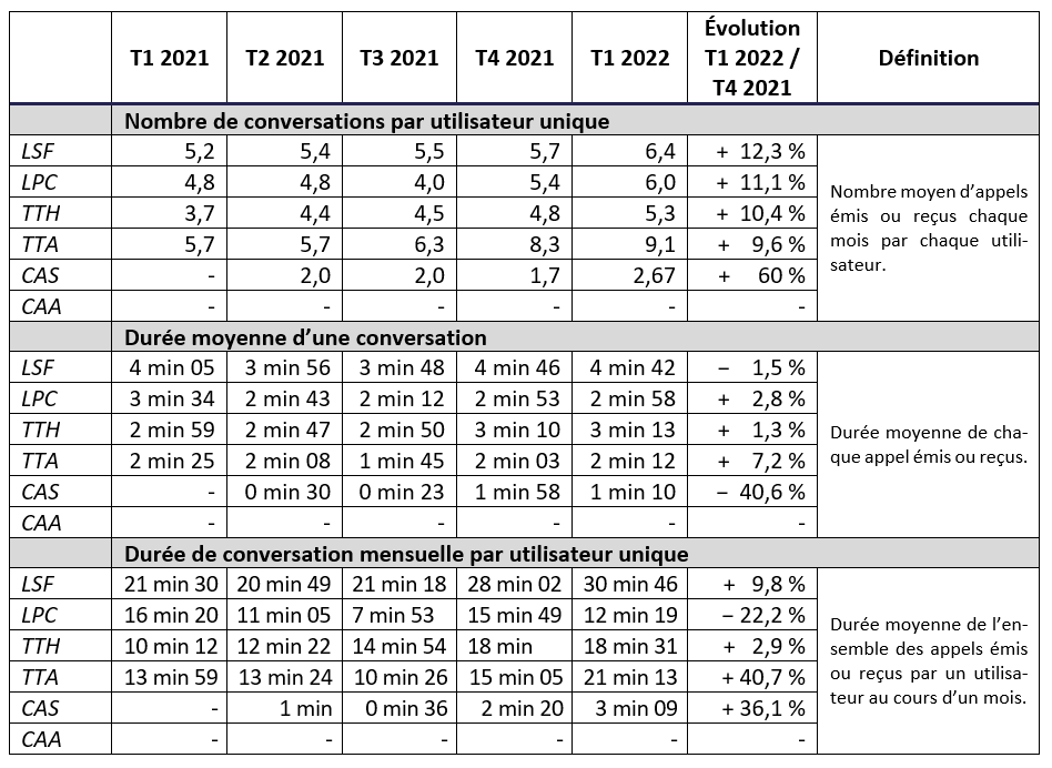 Le présent document est une synthèse des indicateurs mesurés et transmis à l’Arcep, pour le 1er trimestre 2022, par les opérateurs Bouygues Telecom, Bouygues Telecom – Business Distribution, Coriolis, Digicel Antilles françaises – Guyane, Free, Free mobile, La Poste Mobile, Outremer Telecom, Orange, Orange Caraïbes, SFR, SRR.