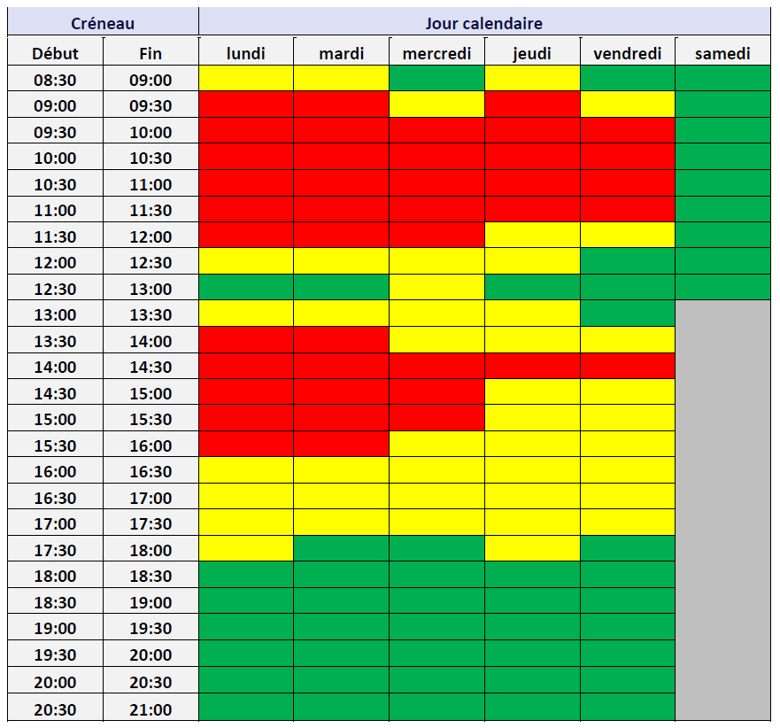 Le tableau ci-dessous représente l’activité relative des centres de relais téléphonique (CRT) pour chaque créneau d’une demi-heure. Les créneaux horaires sont regroupés en fonction de leur charge : en vert le tiers le moins chargé, en jaune le tiers moyennement chargé, en rouge le tiers le plus chargé.