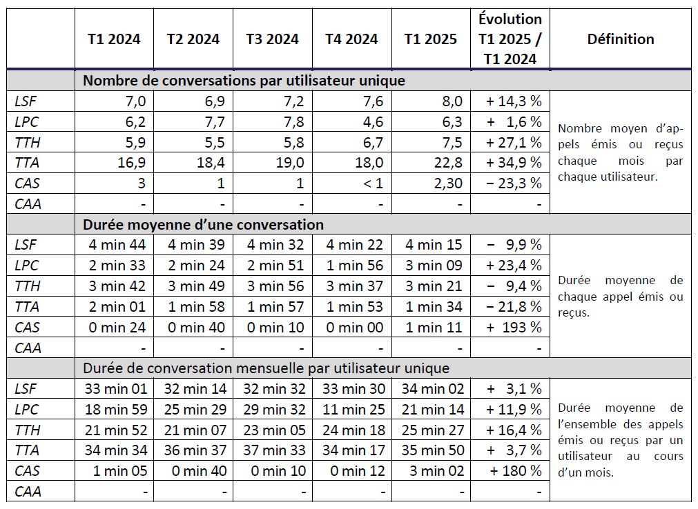 Le présent document est une synthèse des indicateurs mesurés et transmis à l’Arcep, pour le premier trimestre 2025, par les opérateurs Bouygues Telecom, Coriolis, Free, Free mobile, La Poste Mobile, Outremer Telecom, Orange, Orange Caraïbes, SFR, SRR, Zeop mobile.