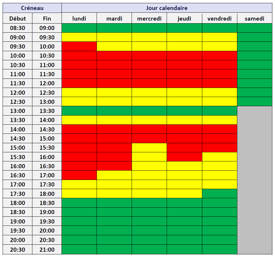 Le tableau ci-dessous représente l’activité relative des centres de relais téléphonique (CRT) pour chaque créneau d’une demi-heure. Les créneaux horaires sont regroupés en fonction de leur charge : en vert le tiers le moins chargé, en jaune le tiers moyennement chargé, en rouge le tiers le plus chargé.