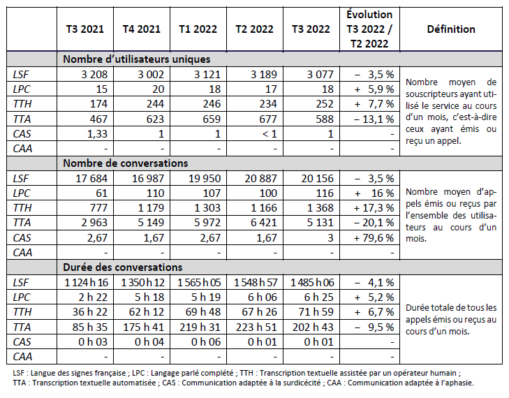 Conformément à la décision no 2018-0535 de l’Arcep en date du 3 mai 2018, les opérateurs de communication électronique proposant, en application du p) du I de l’article L. 33-1 du CPCE, un accès des utilisateurs finals sourds, malentendants, sourdaveugles et aphasiques à une offre de service de communications électroniques, sont tenus de mesurer et de transmettre à l’Arcep les indicateurs d’utilisation et de qualité de ces offres définis en annexe de la décision no 2018-0535 précitée.