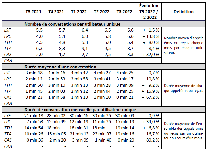 Le présent document est une synthèse des indicateurs mesurés et transmis à l’Arcep, pour le troisième trimestre 2022, par les opérateurs Bouygues Telecom, Bouygues Telecom – Business Distribution, Digicel Antilles françaises – Guyane, Free, Free mobile, La Poste Mobile, Outremer Telecom, Orange, Orange Caraïbes, SFR, SRR.