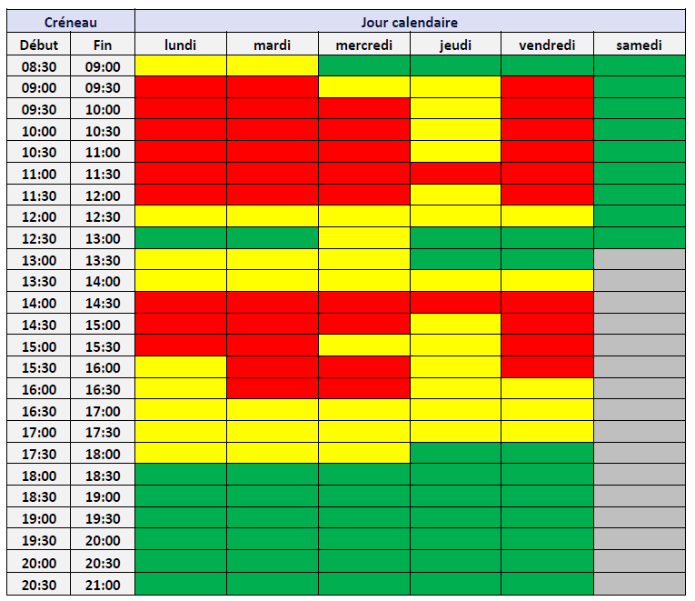Le tableau ci-dessous représente l’activité relative des centres de relais téléphonique (CRT) pour chaque créneau d’une demi-heure. Les créneaux horaires sont regroupés en fonction de leur charge : en vert le tiers le moins chargé, en jaune le tiers moyennement chargé, en rouge le tiers le plus chargé.