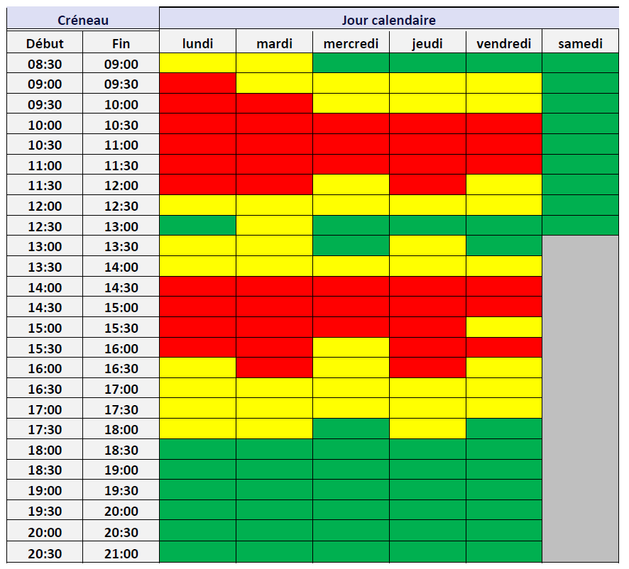 Le tableau ci-dessous représente l’activité relative des centres de relais téléphonique (CRT) pour chaque créneau d’une demi-heure. Les créneaux horaires sont regroupés en fonction de leur charge : en vert le tiers le moins chargé, en jaune le tiers moyennement chargé, en rouge le tiers le plus chargé.
