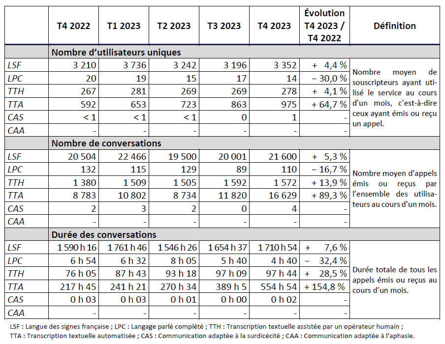 Conformément à la décision no 2018-0535 de l’Arcep en date du 3 mai 2018, les opérateurs de communication électronique proposant, en application du p) du I de l’article L. 33-1 du CPCE, un accès des utilisateurs finals sourds, malentendants, sourdaveugles et aphasiques à une offre de service de communications électroniques, sont tenus de mesurer et de transmettre à l’Arcep les indicateurs d’utilisation et de qualité de ces offres définis en annexe de la décision no 2018-0535 précitée.