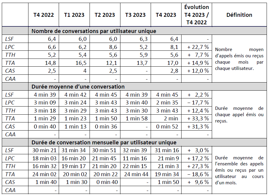 Le présent document est une synthèse des indicateurs mesurés et transmis à l’Arcep, pour le quatrième trimestre 2023, par les opérateurs Bouygues Telecom, Bouygues Telecom – Business Distribution, Coriolis, Digicel Antilles françaises – Guyane, Free, Free mobile, La Poste Mobile, Outremer Telecom, Orange, Orange Caraïbes, SFR, SRR, Zeop.