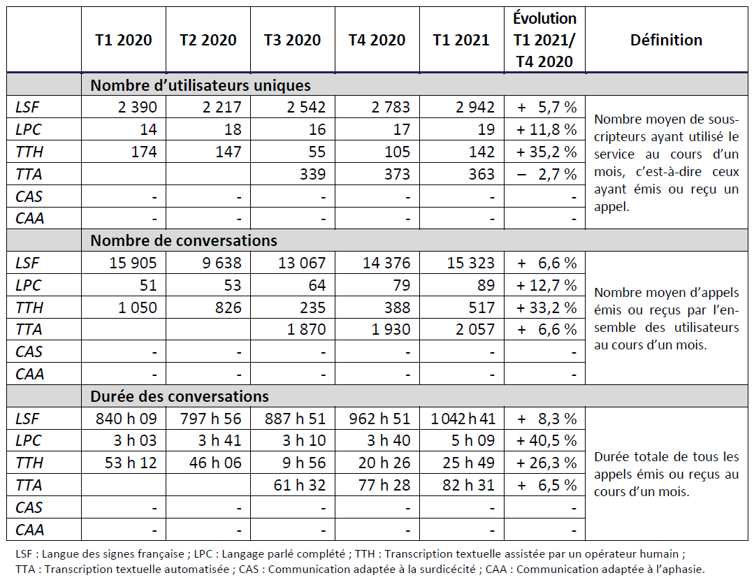 Enfin, la mise en place d’une offre de services spécifiquement consacrés aux utilisateurs sourdaveugles et aphasiques n’est toujours pas effective, et doit devenir une priorité pour les opérateurs.