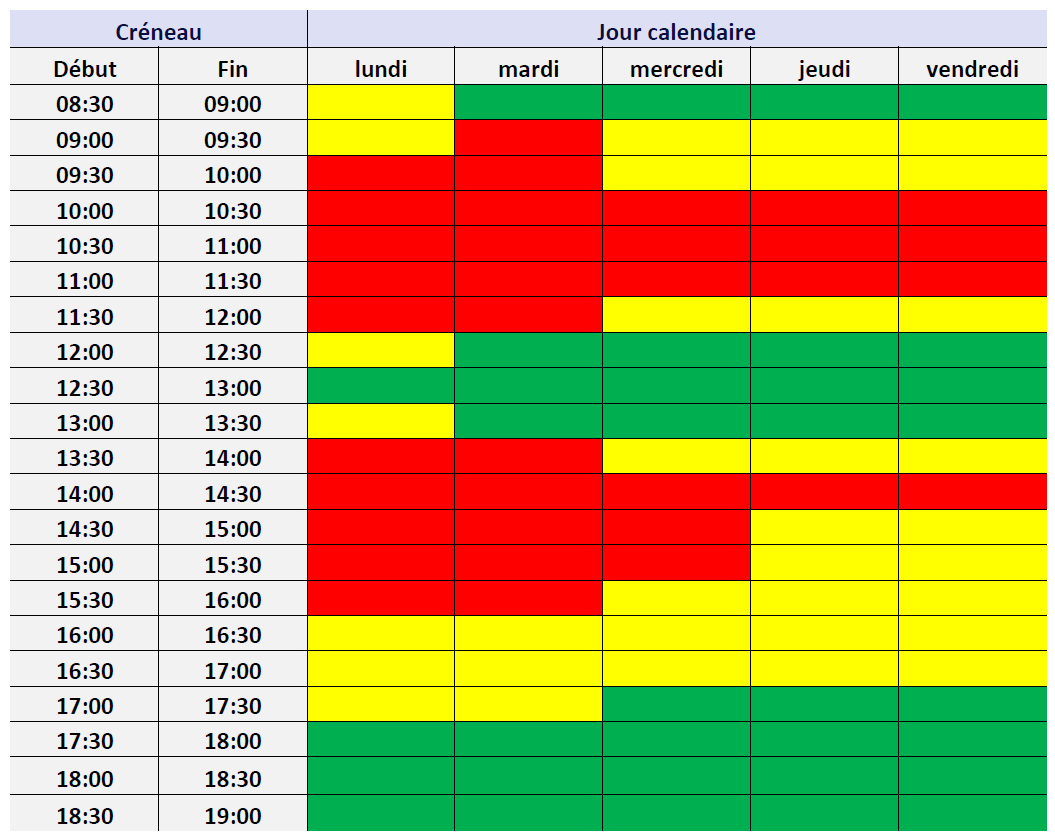 Le tableau ci-dessous représente l’activité relative des centres de relais téléphonique (CRT) pour chaque créneau d’une demi-heure. Les créneaux horaires sont regroupés en fonction de leur charge : en vert le tiers le moins chargé, en jaune le tiers moyennement chargé, en rouge le tiers le plus chargé.