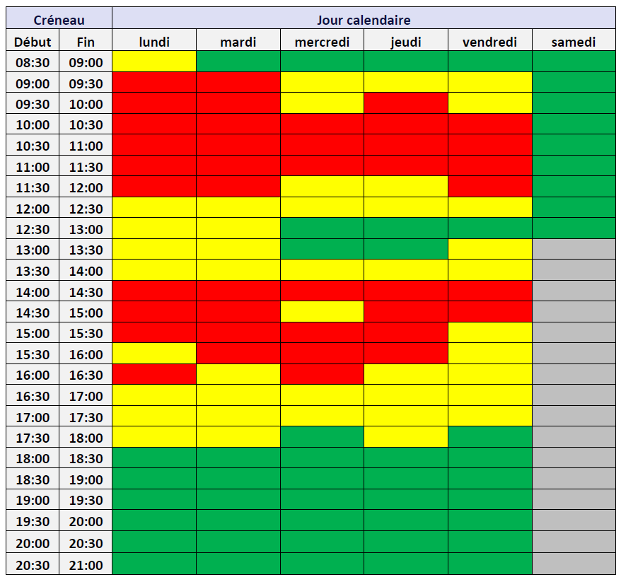Le tableau ci-dessous représente l’activité relative des centres de relais téléphonique (CRT) pour chaque créneau d’une demi-heure. Les créneaux horaires sont regroupés en fonction de leur charge : en vert le tiers le moins chargé, en jaune le tiers moyennement chargé, en rouge le tiers le plus chargé.