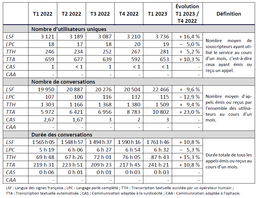 Conformément à la décision no 2018-0535 de l’Arcep en date du 3 mai 2018, les opérateurs de communication électronique proposant, en application du p) du I de l’article L. 33-1 du CPCE, un accès des utilisateurs finals sourds, malentendants, sourdaveugles et aphasiques à une offre de service de communications électroniques, sont tenus de mesurer et de transmettre à l’Arcep les indicateurs d’utilisation et de qualité de ces offres définis en annexe de la décision no 2018-0535 précitée.