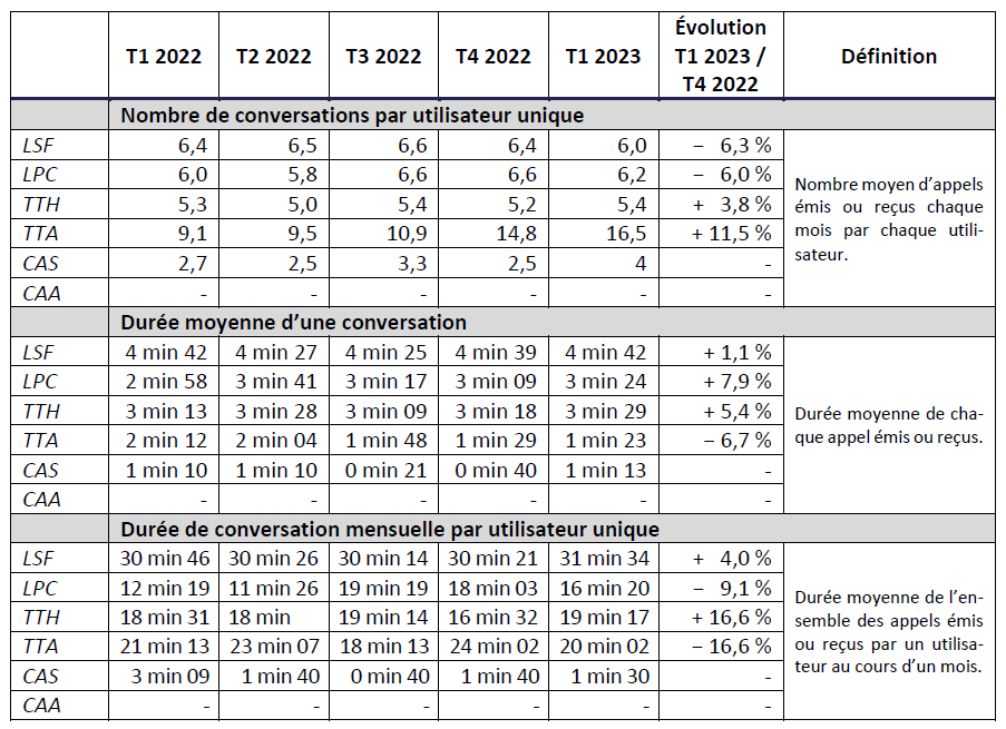 Le présent document est une synthèse des indicateurs mesurés et transmis à l’Arcep, pour le premier trimestre 2023, par les opérateurs Bouygues Telecom, Bouygues Telecom – Business Distribution, Digicel Antilles françaises – Guyane, Free, Free mobile, La Poste Mobile, Outremer Telecom, Orange, Orange Caraïbes, SFR, SRR.