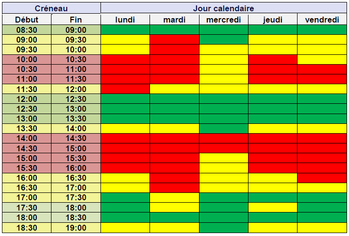 Le tableau ci-dessous représente l’activité relative des centres de relais téléphonique (CRT) pour chaque créneau d’une demi-heure. Les créneaux horaires sont regroupés en fonction de leur charge (en vert le tiers le moins chargé, en jaune le tiers moyennement chargé, en rouge le tiers le plus chargé). Pour rappel, en vertu de l’article D. 98-14 du CPCE, jusqu'au 30 septembre 2021, le service mentionné à l’article L. 33-1, I, p) du CPCE fonctionne au minimum du lundi au vendredi de 8 h 30 à 19 heures, hors jours fériés.