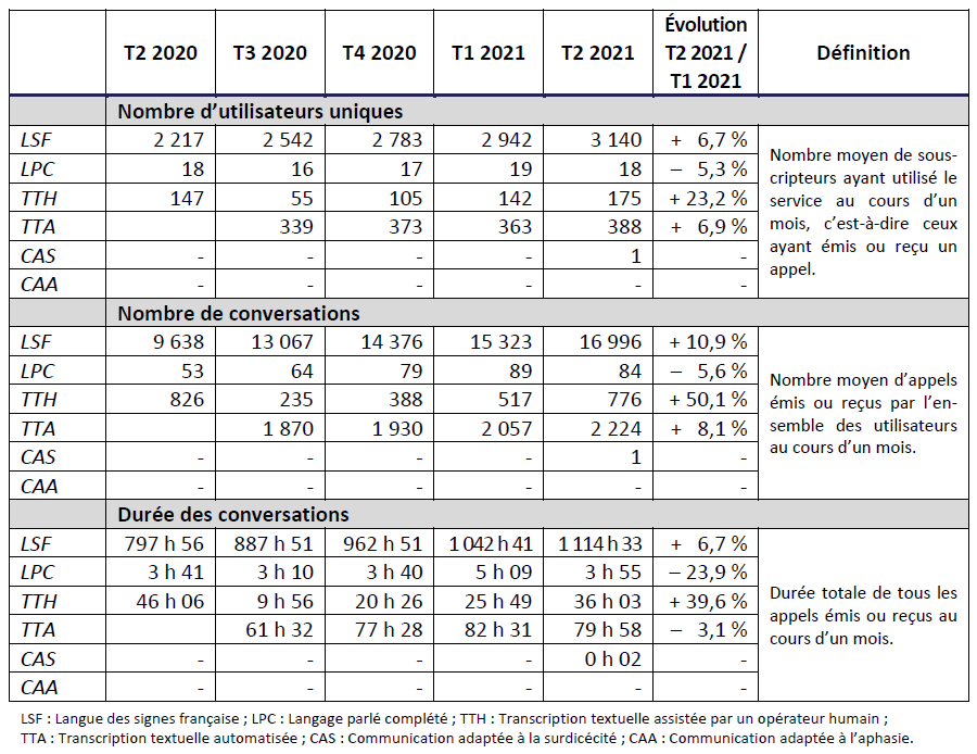 Enfin, l’offre destinée aux personnes sourdaveugles a commencé à être mise en place au cours de ce trimestre par certains opérateurs, occasionnant quelques communications au centre relais téléphonique. Quant à l’offre de services spécifiquement dédiée aux utilisateurs aphasiques, elle n’est encore pas effective, et son lancement doit devenir une priorité pour les opérateurs.