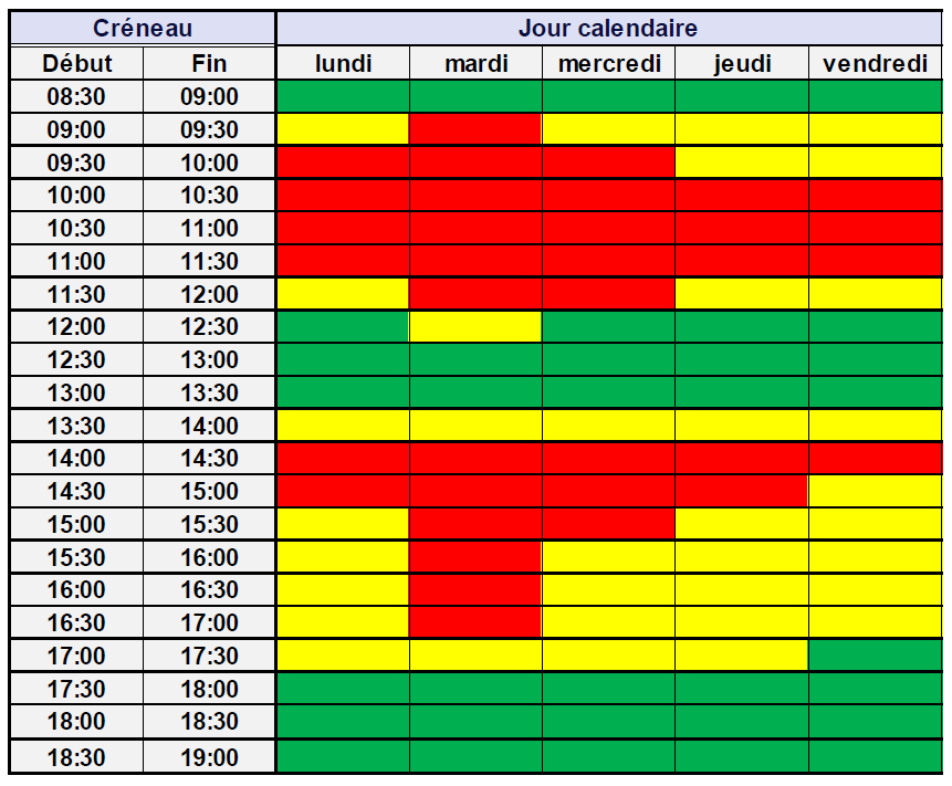 Le tableau ci-dessous représente l’activité relative des centres de relais téléphonique (CRT) pour chaque créneau d’une demi-heure. Les créneaux horaires sont regroupés en fonction de leur charge : en vert le tiers le moins chargé, en jaune le tiers moyennement chargé, en rouge le tiers le plus chargé.
