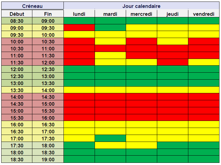 Le tableau ci-dessous représente l’activité relative des centres de relais téléphonique (CRT) pour chaque créneau d’une demi-heure. Les créneaux horaires sont regroupés en fonction de leur charge : en vert le tiers le moins chargé, en jaune le tiers moyennement chargé, en rouge le tiers le plus chargé. Pour rappel, en vertu de l’article D. 98-14 du CPCE, jusqu'au 30 septembre 2021, le service mentionné à l’article L. 33-1, I, p) du CPCE fonctionne au minimum du lundi au vendredi de 8 h 30 à 19 heures, hors jours fériés.