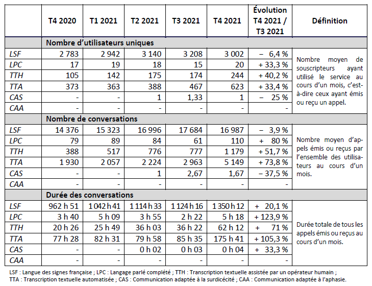 Celui-ci est marqué par une augmentation significative de la durée des conversations, et surtout par une très forte baisse des indicateurs de prise en charge des appels en langue des signes française, que ce soit en moins de trois minutes ou en moins de trente secondes. Le nombre d’utilisateurs uniques de cette modalité a diminué pour la première fois, alors qu’une fraction très importante de la population sourde et malentendante française continue de ne pas utiliser les services mis en place par les opérateurs. Cette situation a en outre provoqué un report vers les modalités de langage parlé-complété et surtout de transcription texte.