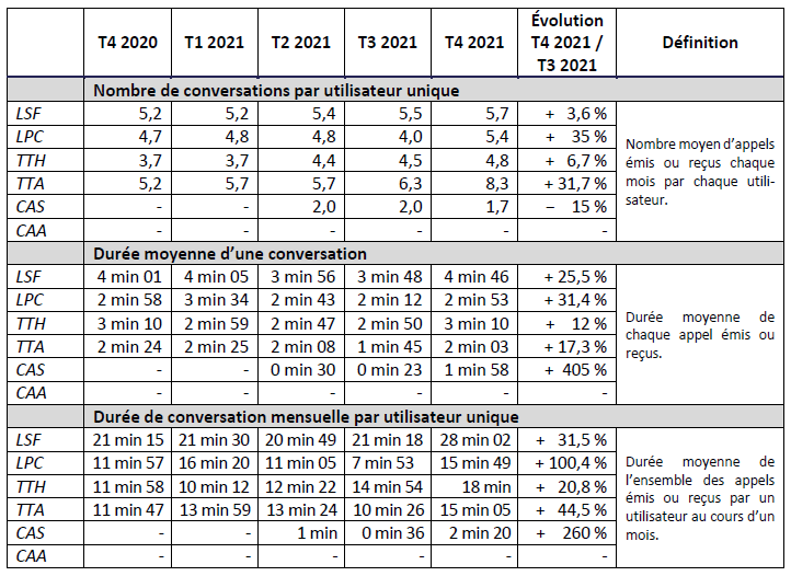Depuis le 1er octobre 2021, conformément à l’article D. 98-14 du code des postes et des communications électroniques, les plages horaires d’ouverture minimale des services sont étendues de deux heures du lundi au vendredi ; ceux-ci sont désormais accessibles jusqu’à 21 heures. Ces plages horaires sont également étendues au samedi, de 8 heures 30 à 13 heures. En outre, la « limite d’usage raisonnable » accordée à chaque abonné est passée d’une heure à trois heures mensuelles ce même 1er octobre 2021.