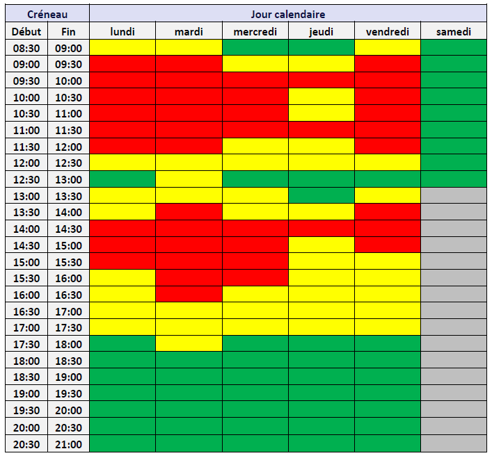 Le tableau ci-dessous représente l’activité relative des centres de relais téléphonique (CRT) pour chaque créneau d’une demi-heure. Les créneaux horaires sont regroupés en fonction de leur charge : en vert le tiers le moins chargé, en jaune le tiers moyennement chargé, en rouge le tiers le plus chargé.