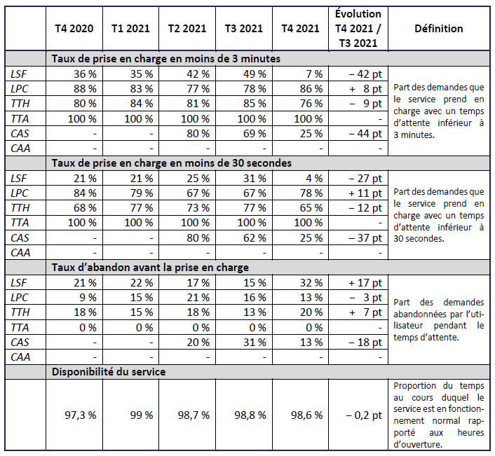 Ces indicateurs de qualité traduisent la très grande difficulté pour de nombreux abonnés à avoir accès au service dans des délais raisonnables. Certains de ces indicateurs demeurent en deçà des niveaux définis par l’Arcep dans sa décision no 2018‑0535.