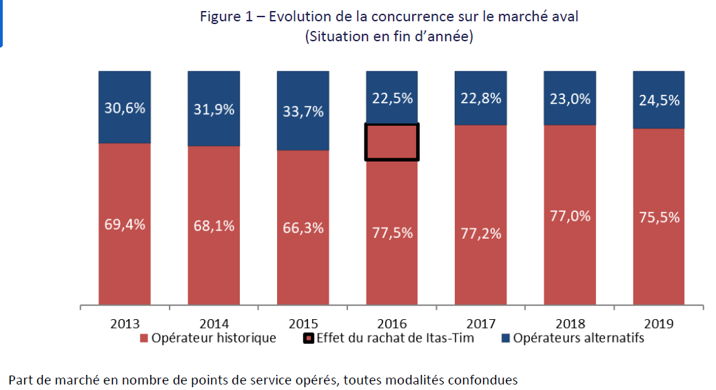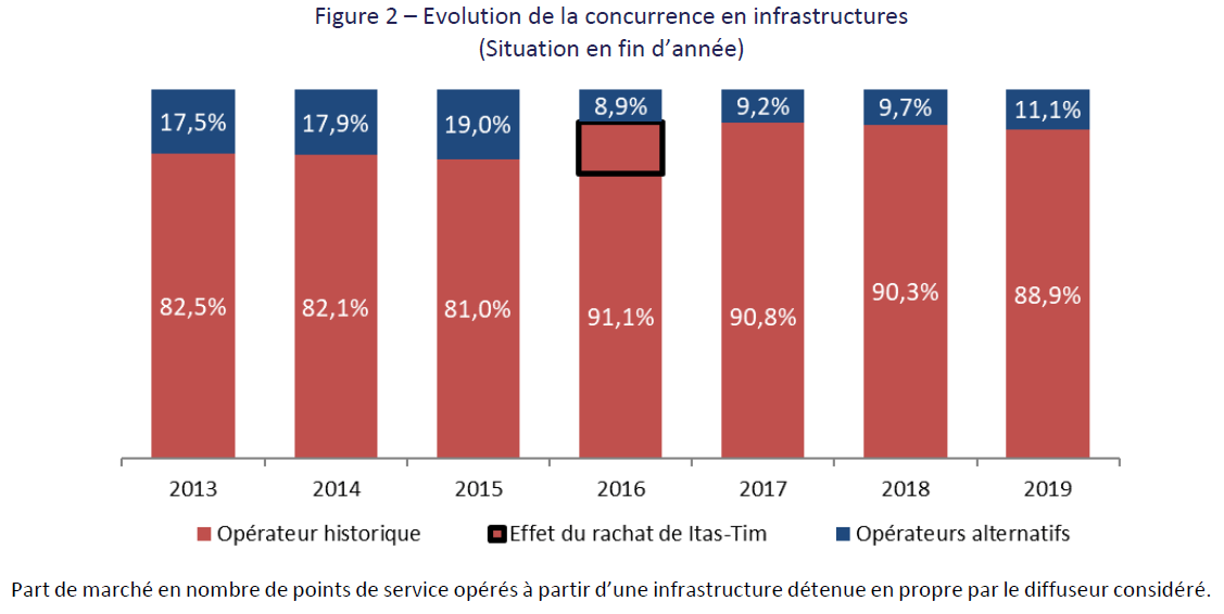 A la fin de l’année 2019, 24,5 % des fréquences des multiplex étaient diffusées par le concurrent de l’opérateur historique. L’histogramme suivant indique les parts de marché de l’opérateur historique et des diffuseurs alternatifs au 31 décembre de chaque année, en nombre de points de service opérés. Ces pourcentages ne reflètent pas les parts de marché en chiffre d’affaires réalisé auprès des multiplex, car les tarifs de diffusion varient d’un site à l’autre.