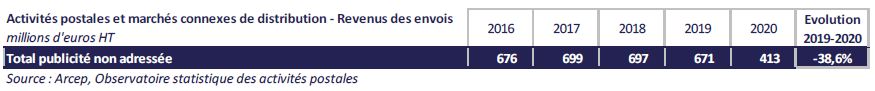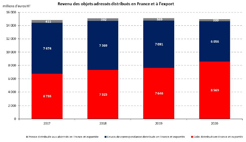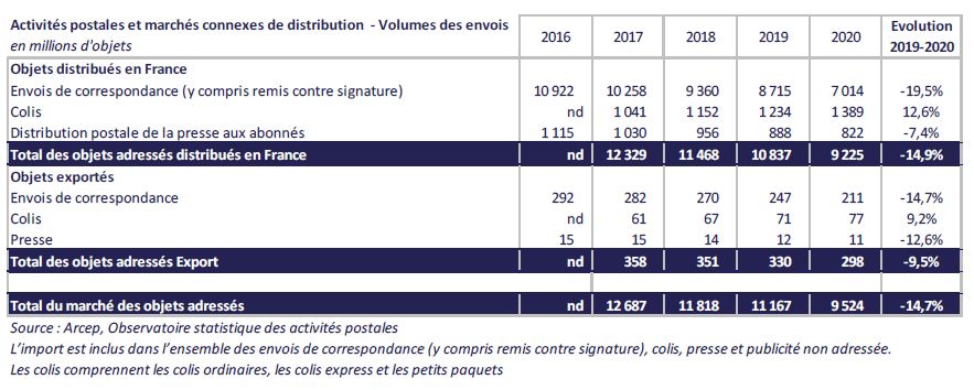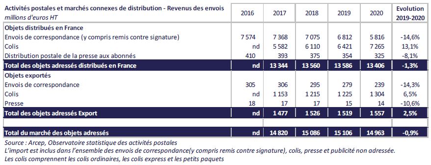 Les flux d’envois de correspondance distribués en France (y compris les plis remis contre signature) se contractent pour la treizième année consécutive avec un repli sans précédent de -19,5% en 2020 (contre -6,5% par an en moyenne entre 2013 et 2019). Cette contraction touche tous les types de courriers (plis prioritaires, urgents ou économiques, courrier égrené ou envois en nombre, plis remis contre signature) et l’ensemble de l’année 2020, mais particulièrement le deuxième trimestre, période durant laquelle le premier confinement a fortement impacté l’activité des entreprises et des particuliers. Le recul du revenu afférent aux envois de correspondance distribués en France (-14,6% en 2020) reste inférieur à celui des volumes en raison des accroissements tarifaires présents sur pratiquement tous les types de courrier du service universel.