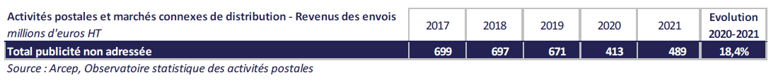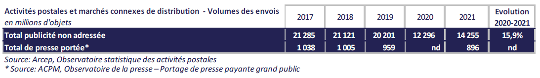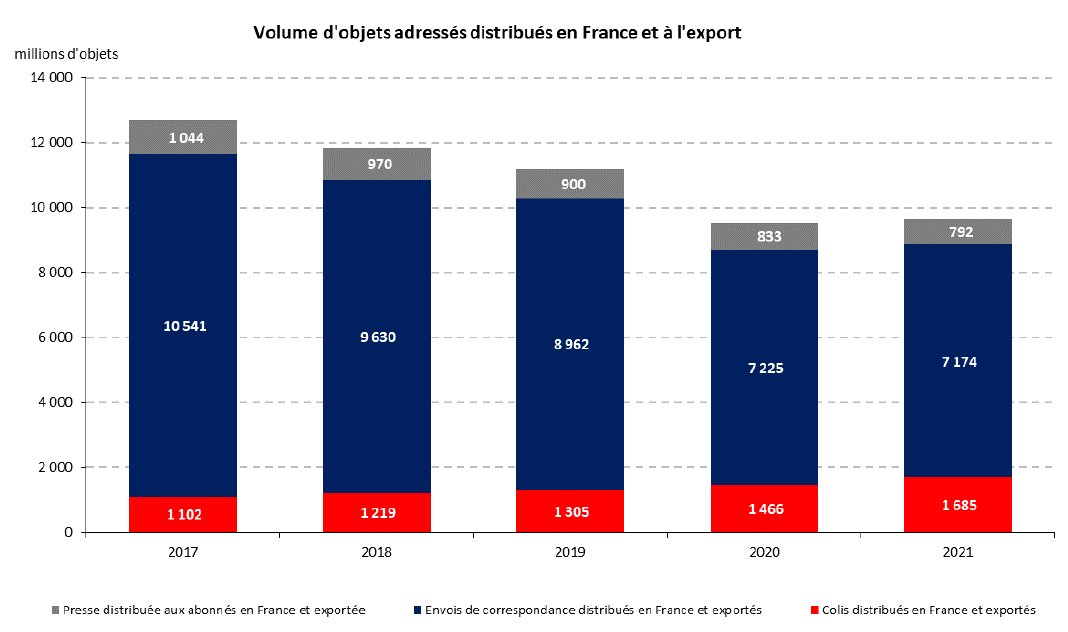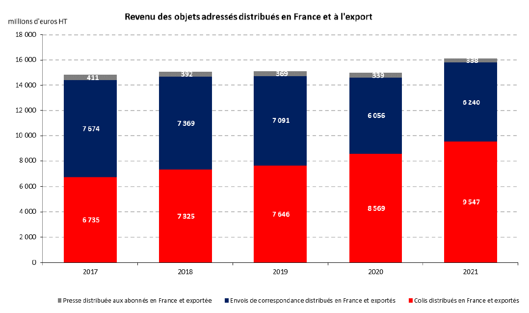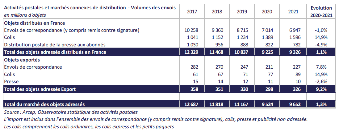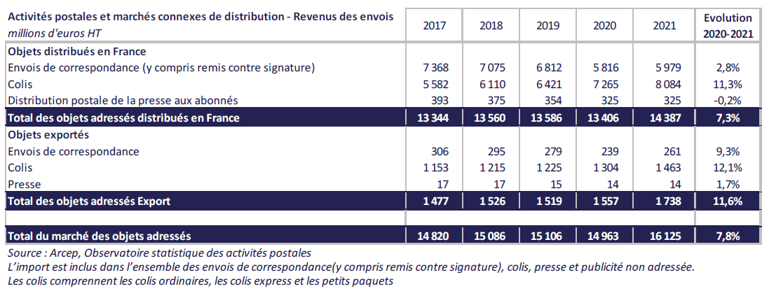 Les flux d’envois de correspondance distribués en France (y compris les plis remis contre signature) se contractent pour la quatorzième année consécutive avec un faible repli de -1 % en 2021 après la chute sans précédent en 2020 (-19,5 % en un an). Cette contraction ne touche que certains types de courriers (plis prioritaires et urgents, courrier égrené ou envois en nombre), tandis que le volume de certains produits augmente (plis non urgents, plis remis contre signature).Le revenu afférent aux envois de correspondance distribués en France progresse quant à lui (+2,8 % en 2021), les augmentations tarifaires qu’ont connues pratiquement tous les types de courrier du service universel compensant la baisse des volumes.