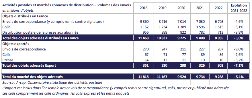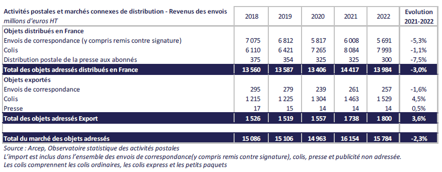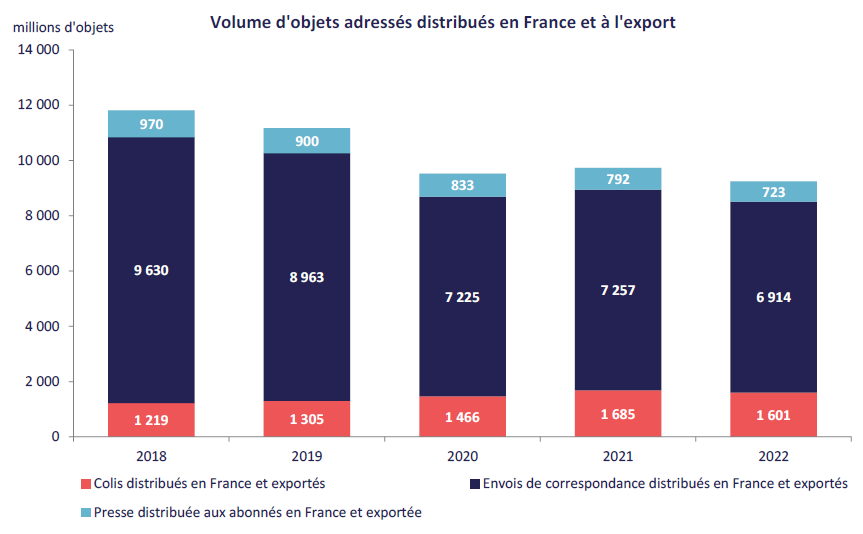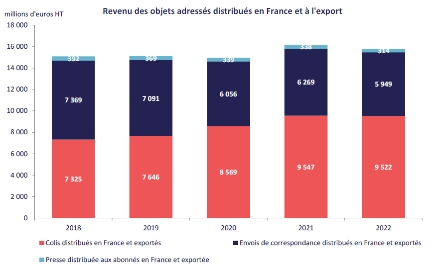 En 2022, 9,2 milliards d’objets adressés (plis, colis, presse par circuit postal) ont été distribués en France ou exportés, pour un revenu s’élevant à 15,8 milliards d’euros hors taxes. En repli d’environ 5 % par rapport à 2021, le volume d’objets adressés diminue à un rythme légèrement inférieur aux années précédant la crise sanitaire de 2020. Cette baisse s’inscrit dans la continuité de la réduction structurelle des flux postaux engagée depuis quinze ans.